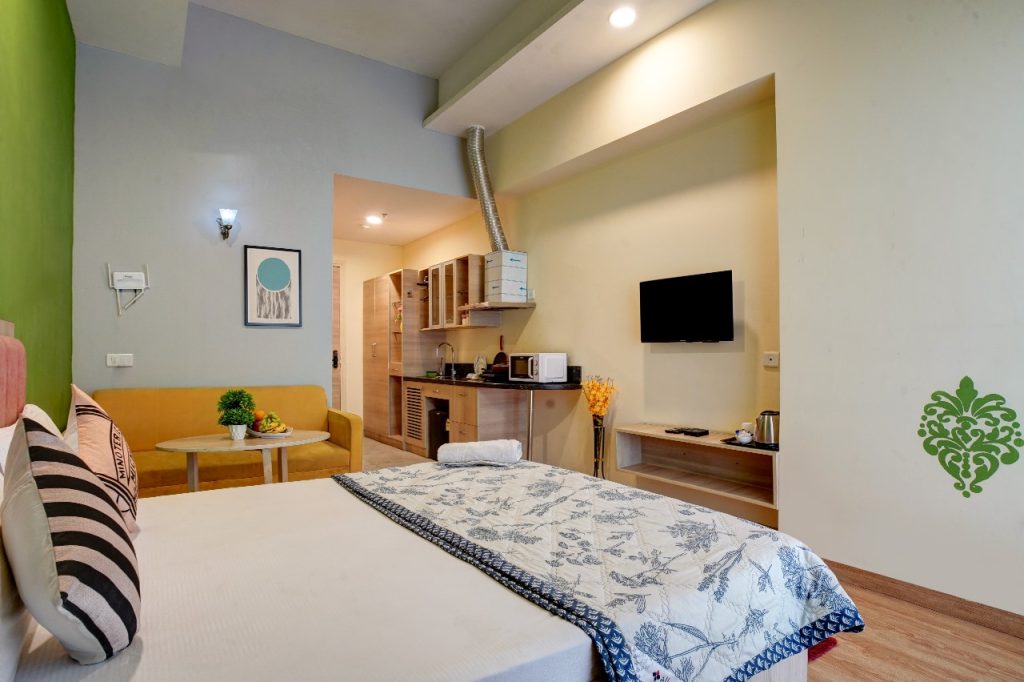 Experience luxury in our Executive Suite, featuring a separate living space, premium bedding, a mini kitchenette, and enhanced amenities—perfect for families or long stays.